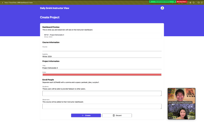 The Daily Smirk originally had no page that allowed instructors to create courses without interacting directly with the back-end. An early prototype demoed on January 31st, 2023.