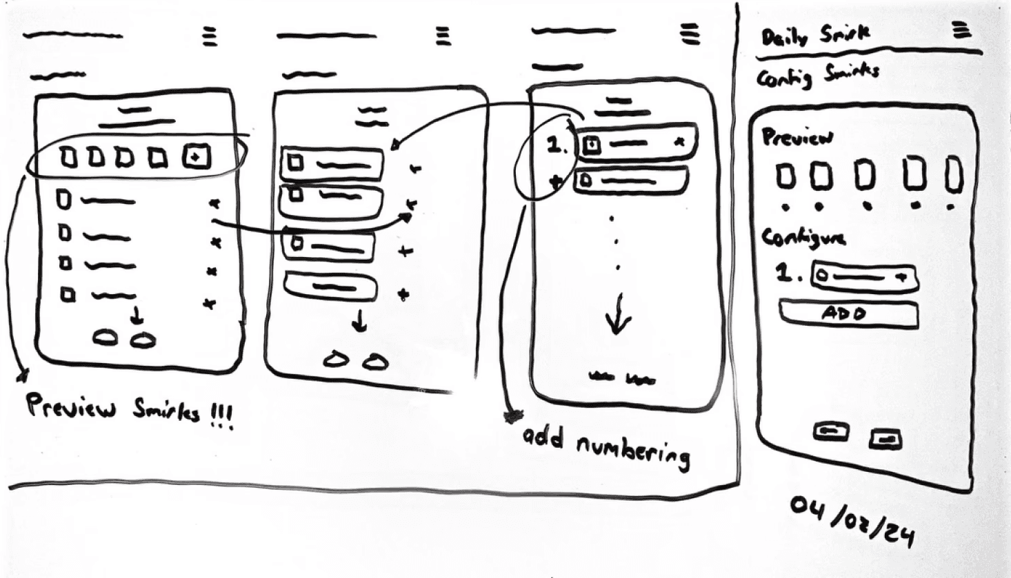 When realizing the ordering of custom Smirks, I gravitated towards the familiar nature of social media applications and how they ordered direct-messaging and short-formed content. This design wouldn't entirely stick, but it led me down simpler paths.