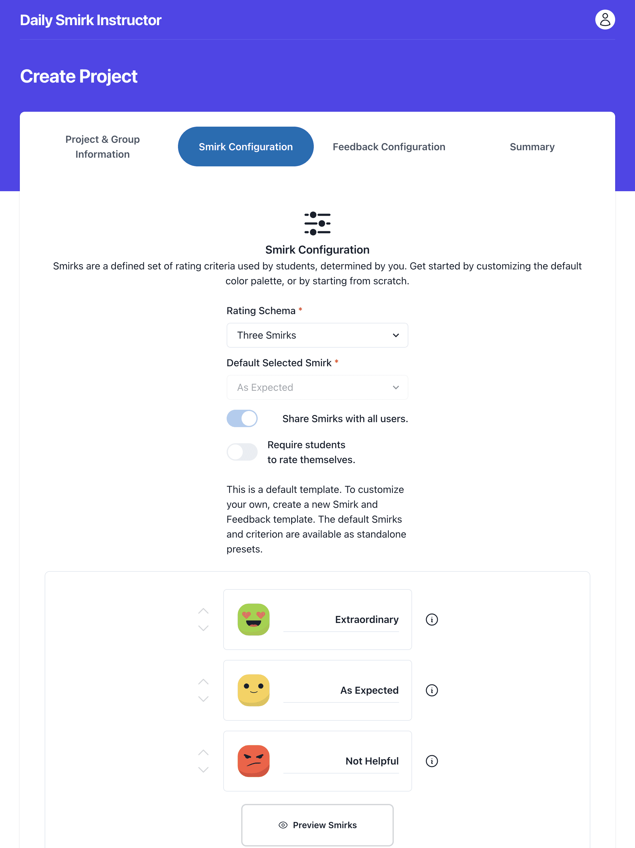 Each section, including Smirk Configuration, contains explanatory text for the users.