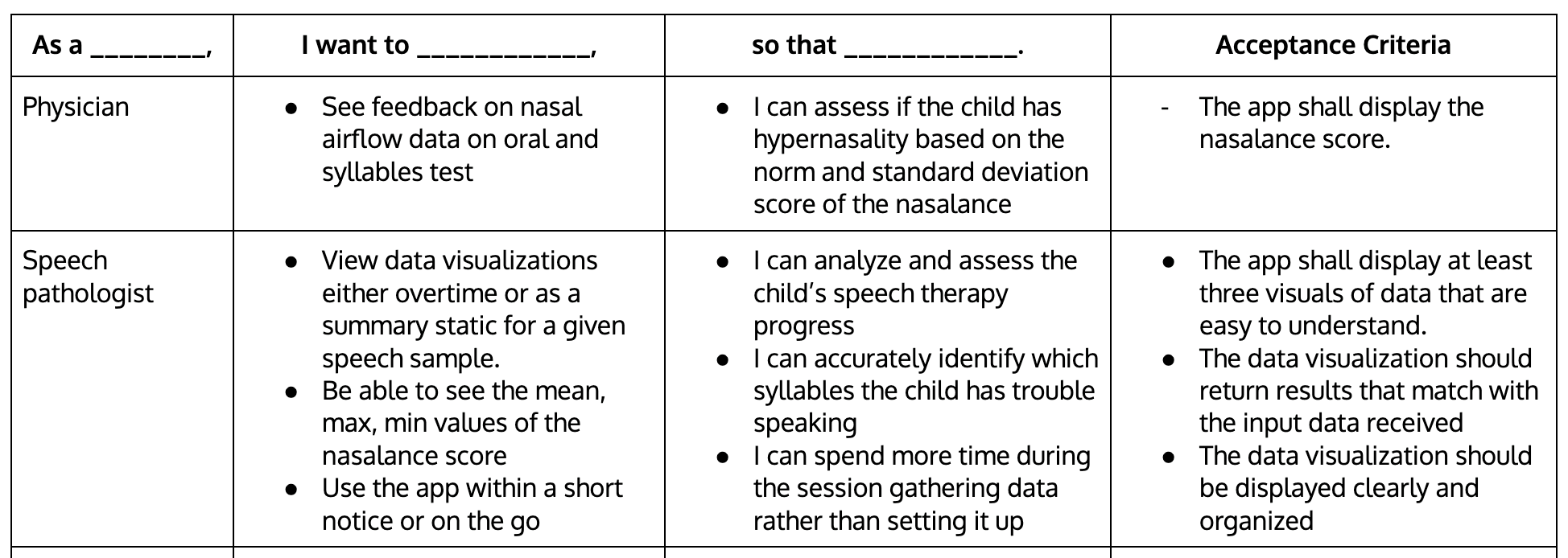 We initially started off with two user stories. Our project partners, within UC Irvine's School of Language Science and Department of Plastic Surgery, influenced the primary requirements of our forming application.
